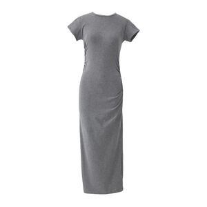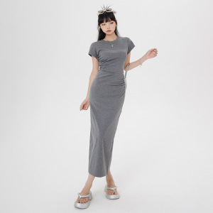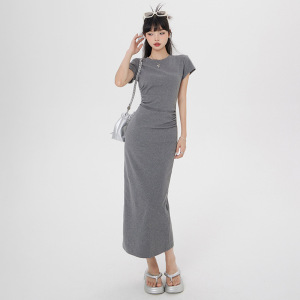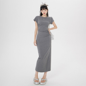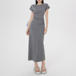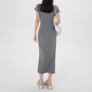 2024欧米アマゾンクロスボーダー女装レトロフランス純灰色半袖ワンピース弾力カジュアルロングスカート女