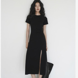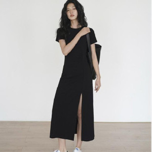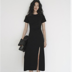 クロスボーダーのオープンフォークのスタイルの丸首の半袖のワンピースの女性の夏の新型のウエストのデザイン感の修身の気質のスカート