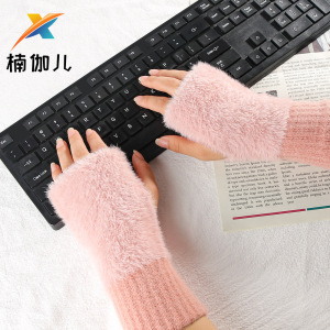 冬用ニット指なし手袋 レディース 冬用裏起毛 アウトドア保温 厚手 手書き用ハーフフィンガーグローブ タッチスクリーン対応 フェイクミンクファー