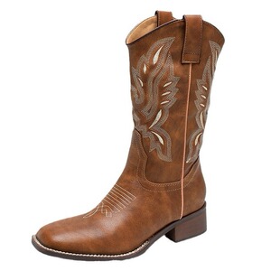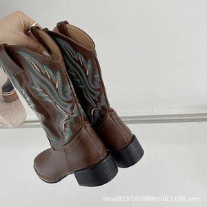 レトロ刺繍V口マーティンブーツ女2024秋茶色太と民族風騎士ショートブーツ西部カウボーイブーツ女