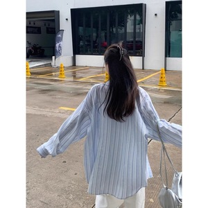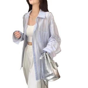青いストライプの長袖の日焼け止めのシャツの上着の女性の春秋のゆったりしているカジュアルなシャツはやせている上着の小さいカーディガンを現します。
