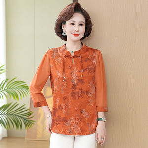 新商品2024春モデル中国風ハスの葉の襟がゆったりしていて、ファッションの7分のシャツの上着のプリントのお母さんのシャツをつなぎ合わせます。
