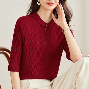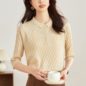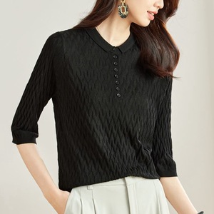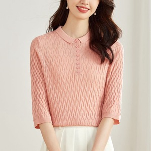 2025年薄手ニット七分袖Tシャツレディースポロ襟半袖トップス格子柄インナーシャツ初秋