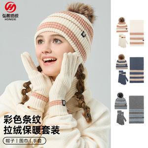 冬の保温屋外ニットマフラー3点セット帽子ストライプ耳保護毛玉帽子マフラー手袋3点セット