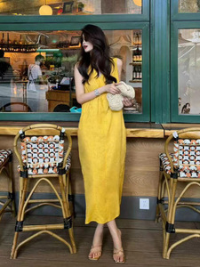 フランスの気質はとてもきれいで、シンプルで、袖なしのマンゴーの黄色の亜麻のワンピースのスカートの女性の2024夏のタイプです。