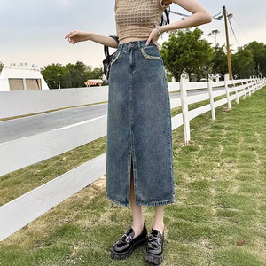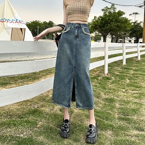 レトロスリットデニムスカート女性用夏薄手2025新作ハイウエスト痩身ミッドレングスAラインヒップスカート