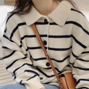2024秋冬の韓国版は小香風の優しいデザイン感を着て、襟のセーターのストライプのニットのカーディガンのコートの女性を編みます。