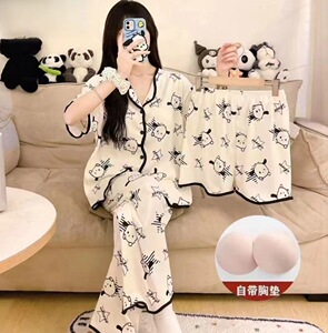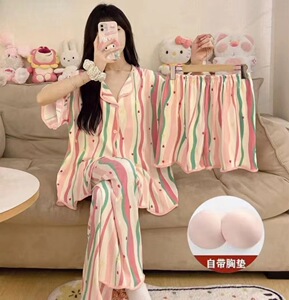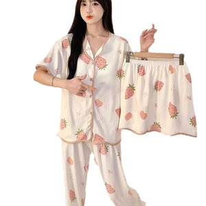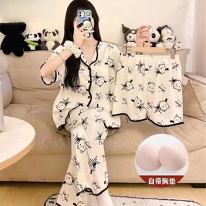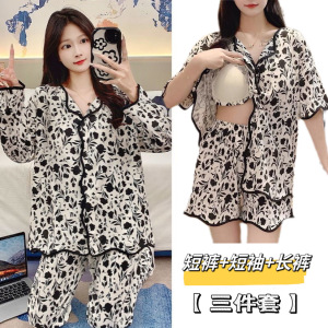 女性用胸パッド付きクロスボーダーパジャマ、サマーカーディガン、半袖ショートパンツ、パンツ、ヨーロッパとアメリカンスタイルのホームウェア3点セット