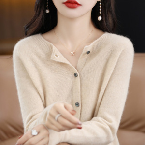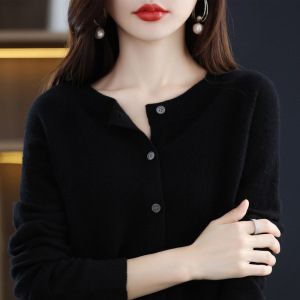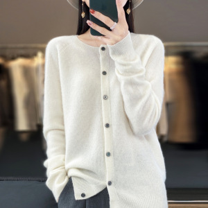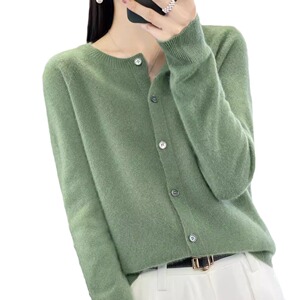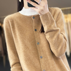 秋装新商品100% 純ウールカーディガン女性セーターコート一線成衣ゆるい長袖ニット上着薄い