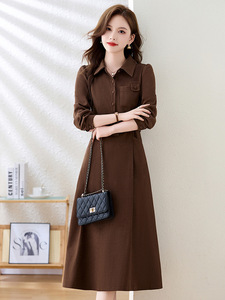 2025年秋の新作、エレガントでシンプル、上品なメイラード風ミディ丈無地ワンピース