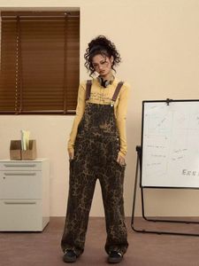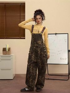 アメリカンレトロヒョウ柄オーバーオールレディースビッグポケットワイドレッグジーンズ2025春秋ワンピースカジュアルパンツ