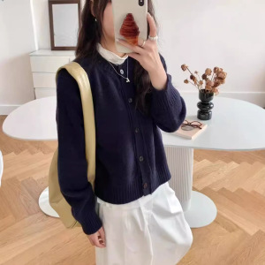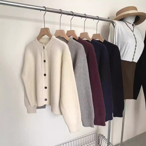 実拍のきれいな色の丸首のゆったりした単列のボタンのコートの女性の復古の簡単な長袖のカーディガンのコートの怠惰な風の上着