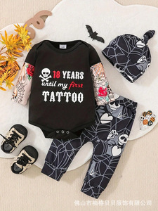新生児赤ちゃん秋冬ハロウィーン服装長袖個性プリントワンピース帽子3点セット