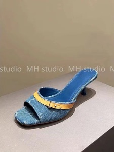 2025新款细跟牛仔布拖鞋时尚百搭拼色外穿凉鞋一字带露趾印花凉鞋
