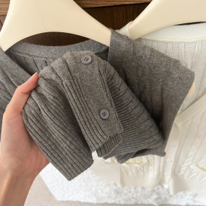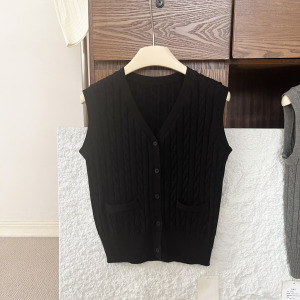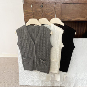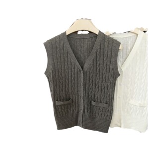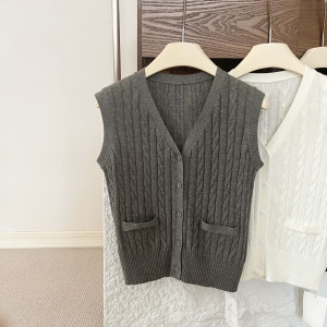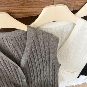 学院風レトログレー麻花vネックベスト春夏重ね着薄いノースリーブニットベスト女性カーディガン