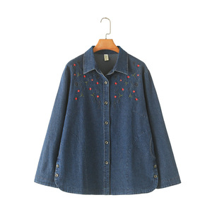 デニムのコートの刺繍の大きいサイズの婦人服の秋の新型の2024カジュアルの大きいサイズの婦人服のカーディガンの200斤のシャツの8933