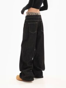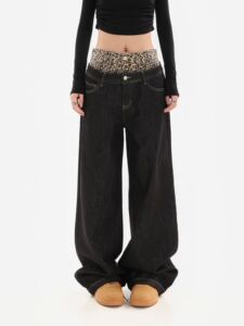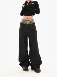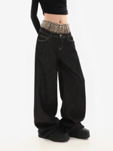 アメリカンレトロデザインヒョウ柄フェイクツーピースジーンズ2025春秋カジュアルルーズストレートワイドレッグパンツ