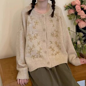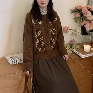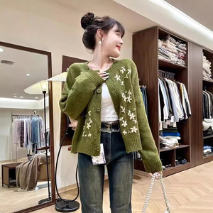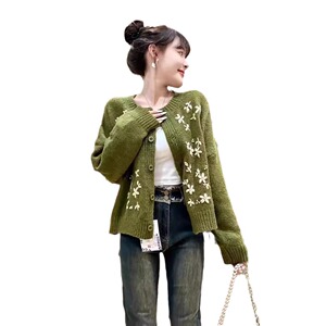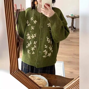 早春の緑のフックの花のニットの上着のレトロで柔らかいモチモチとした刺繍がゆったりしています。