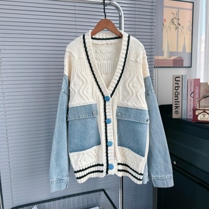 ヨーロッパステーションセーターレディースコート秋冬新作デニムスプライシングデザイン厚みのあるルーズレイジースタイルニットカーディガン
