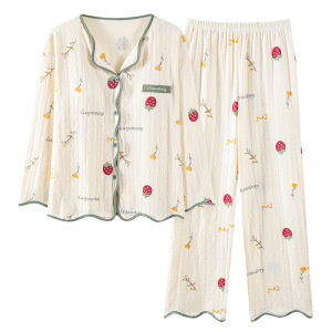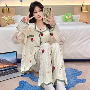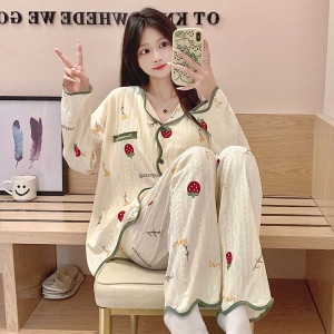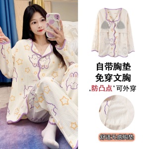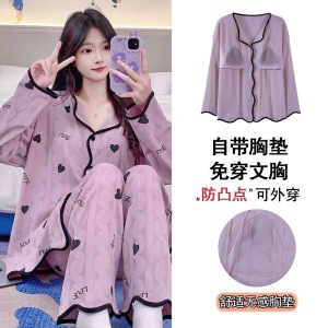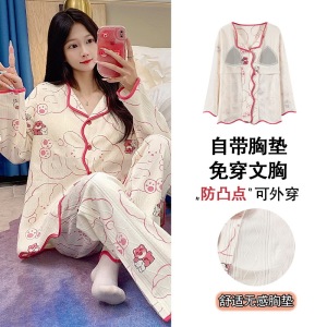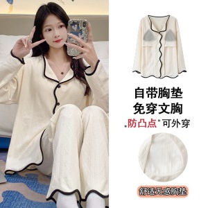 胸パッド付きパジャマ女性春秋綿質長袖カーディガン甘くて可愛いレディース快適秋冬ホームウェアセット