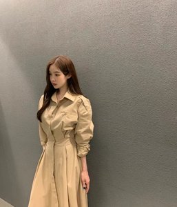 韓国のchi春秋のフランス風の気質は襟の単列のボタンのポケットをひっくり返して腰を収めてやせている長袖のシャツ式のワンピースの女性を現します。