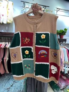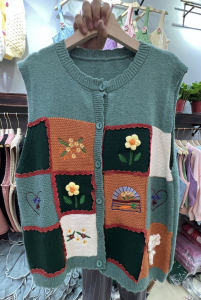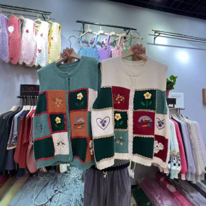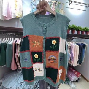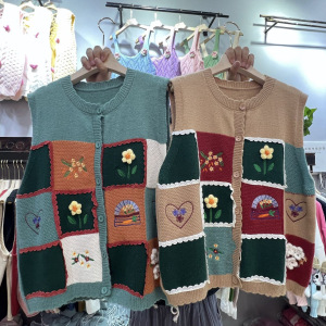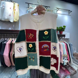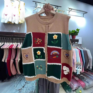 森系のレトロな色のチェス盤の花のセーターの馬甲の女性の春の新型のゆったりしている百合の袖なしのニットの上着