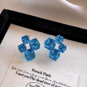 38#シルバー ニードル ブルー ダイヤモンド ジオメトリック スクエア スタッド ピアス