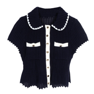 純元Sフレンチ柄カーディガン秋冬新作衝突色透かし彫り優雅気質デザイン感半袖ニット上着