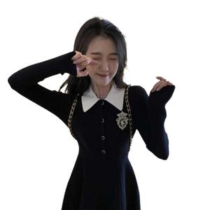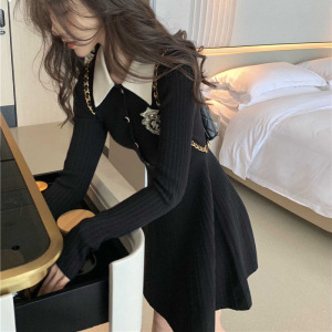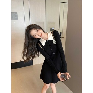 新しい黒色の長袖のニットのワンピースの女性の秋の小さい子供の学院の風は身を修めてやせている気質の小さいスカートの婦人服を現します。
