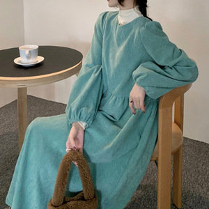 茶休フレンチコーデュロイワンピース女性秋高級感レトロ気質ウエスト森系優しい風初恋ロングスカート