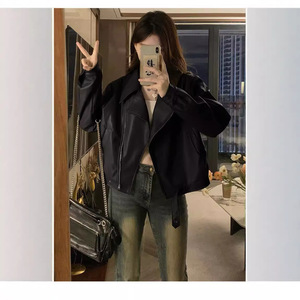 アメリカのレトロなpuの皮の服のコートの女性の2024秋の小さい人はゆったりしていて痩せている機関車の服の短いジャケットの上着を現します。