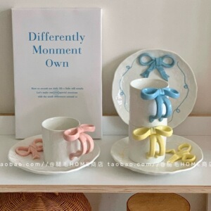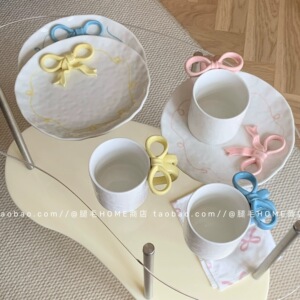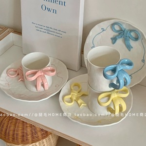 インかわいいガーリーハート手描き立体リボンセラミックマグディナープレートコーヒーカップデザート朝食プレート