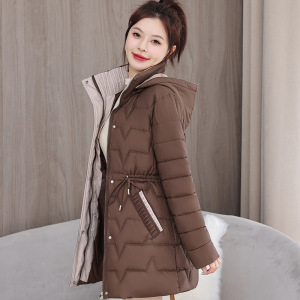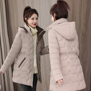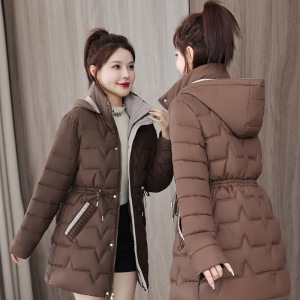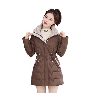 黒金ダウンコットンジャケット レディース 韓国風ファッション 2025年新作 冬用 厚手 ミドル丈 コットンコート ウエストシェイプ コットンジャケット