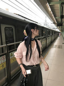 粉色休闲衬衫女夏季薄款法式复古设计感小众宽松防晒长袖衬衣