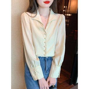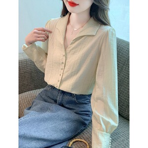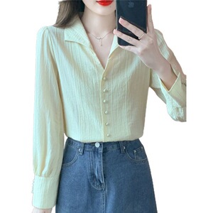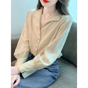 リネン秋服新商品のゆったりとした肌触りの長袖のシックで綺麗なシャツのデザイン感があります。