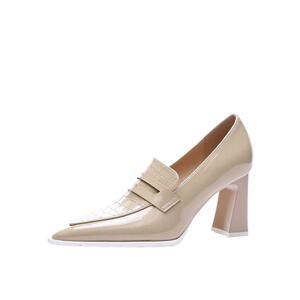 2024年早秋の新型韓国版の先の太いハイヒールの防水台の職業は杏色の粗いことと気質を合わせます。