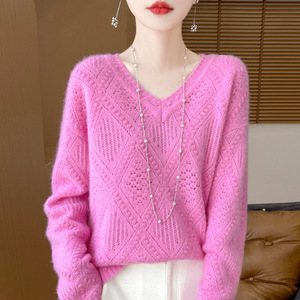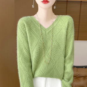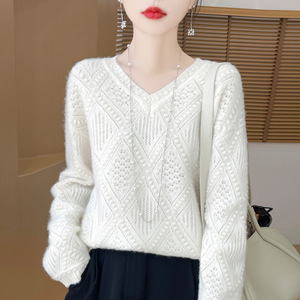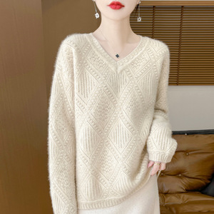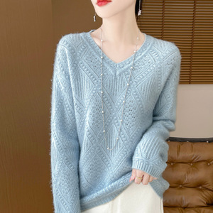 七針厚手Vネック波状韓国風デザイン100%純毛プルオーバー25春秋新作レディース保温トップス