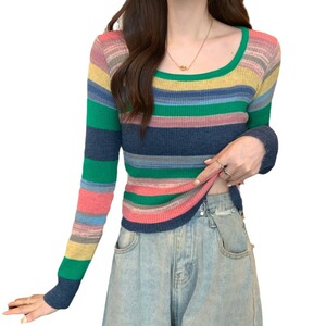 早い秋のストライプの長袖の底のニットの上着のフレンチの方の襟の短いデザイン感の中でセーターの女性の秋冬を掛けます。