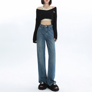 細身ワイドレッグジーンズ レディース 春秋新作 ハイウエスト ゆったり 着痩せ効果 小柄さん向け ストレート ロング丈パンツ
