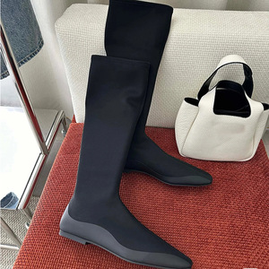 2025年秋 ミニマリストスタイル 多用途 ストレッチ 細身ブーツ レディース ロングソックスブーツ スクエアトゥ フラットソール 膝下丈ブーツ