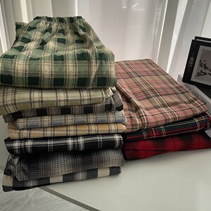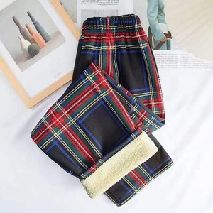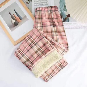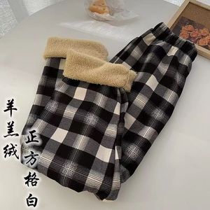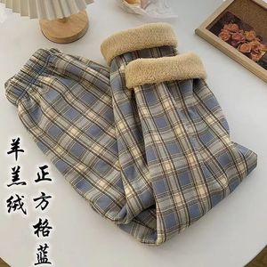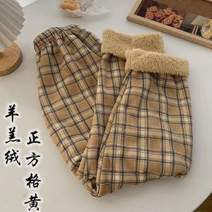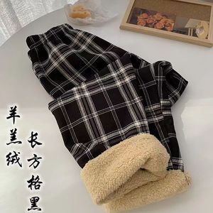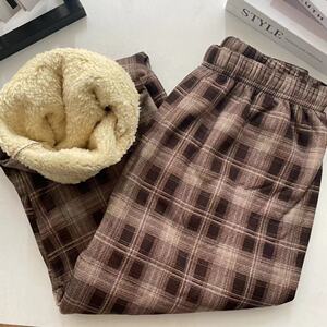 秋冬用ラムウールチェック柄パンツ、裏起毛・厚手、カジュアルレディースパンツ、ハイウエスト、着痩せ効果、ゆったりストレート、万能ワイドパンツ