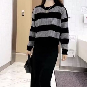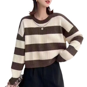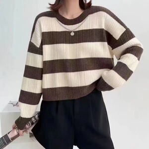 ストライプニットセーター レディース 2025秋冬新作 カジュアル ゆったり 着痩せ効果 バイカラー ラウンドネック ニットプルオーバー レディース