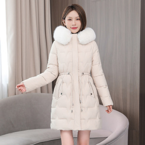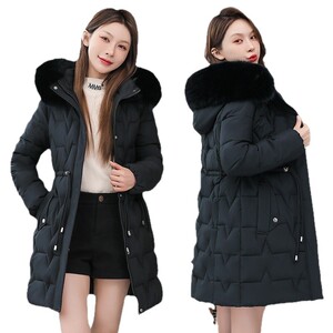2024新型綿服女性冬の中長タイプの修身はやせている韓国版の白い毛の襟が厚いコートの綿入れのロットを見せます。