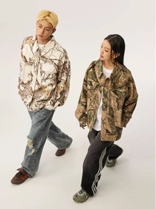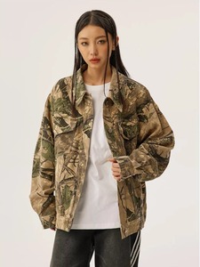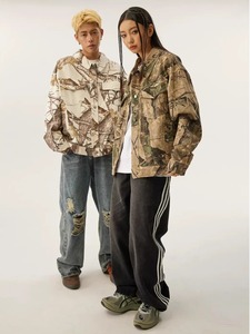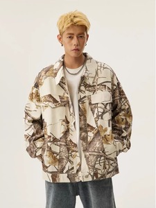 アメリカの街頭で古い迷彩のデニムのコートをします。