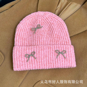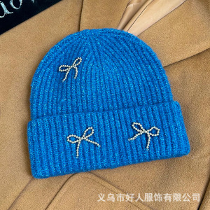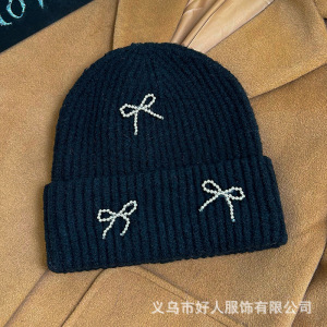 韓国版のファッションの新型の小さい香風の真珠の蝶結びの毛糸の帽子の大きい頭の周りの耳のメリヤスの冷たい帽子の頭の帽子の潮