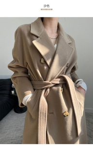 2025秋冬カシミヤコート、カシミヤ80%、羊毛20%、ミドル丈、紐付き、両面ウールコート