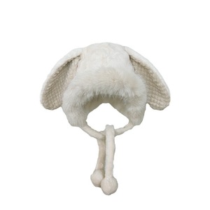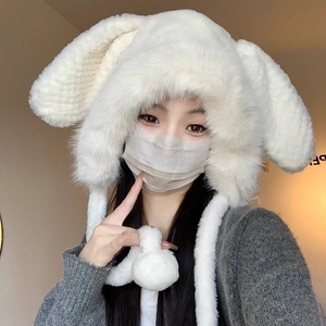 毛のふわふわした帽子の女性の冬のかわいいぬいぐるみのウサギの耳の大きい頭の周りの厚い保温のニットの毛糸の雷の前線の帽子