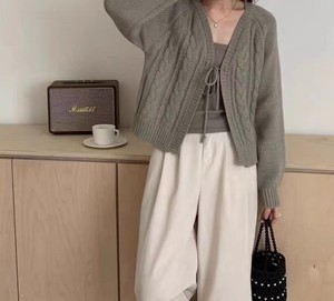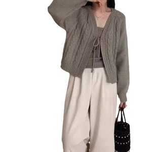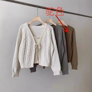 ニットのカーディガンのコートの新型の柔らかいモチモチの短いセーターの上着は丸首のひもの麻の花のマントの2セットの女性を合わせます。