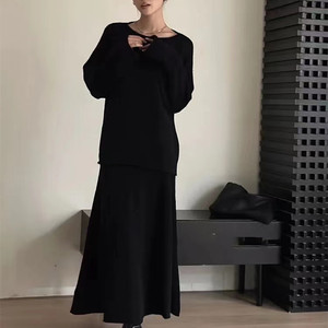 韓国版の怠惰でゆったりしたニットのファッションスーツの女性の肩の上着のA字の魚の尾はお尻の半身のスカートの2つのセットを包みます。