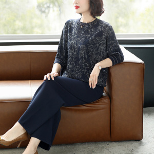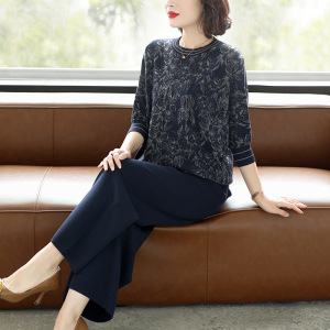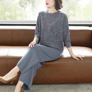 Puyuan カジュアルニットスーツ女性のための 2025 春と秋の新作ルーズラウンドネック七分袖ワイドレッグパンツアイスシルク 2 点セット